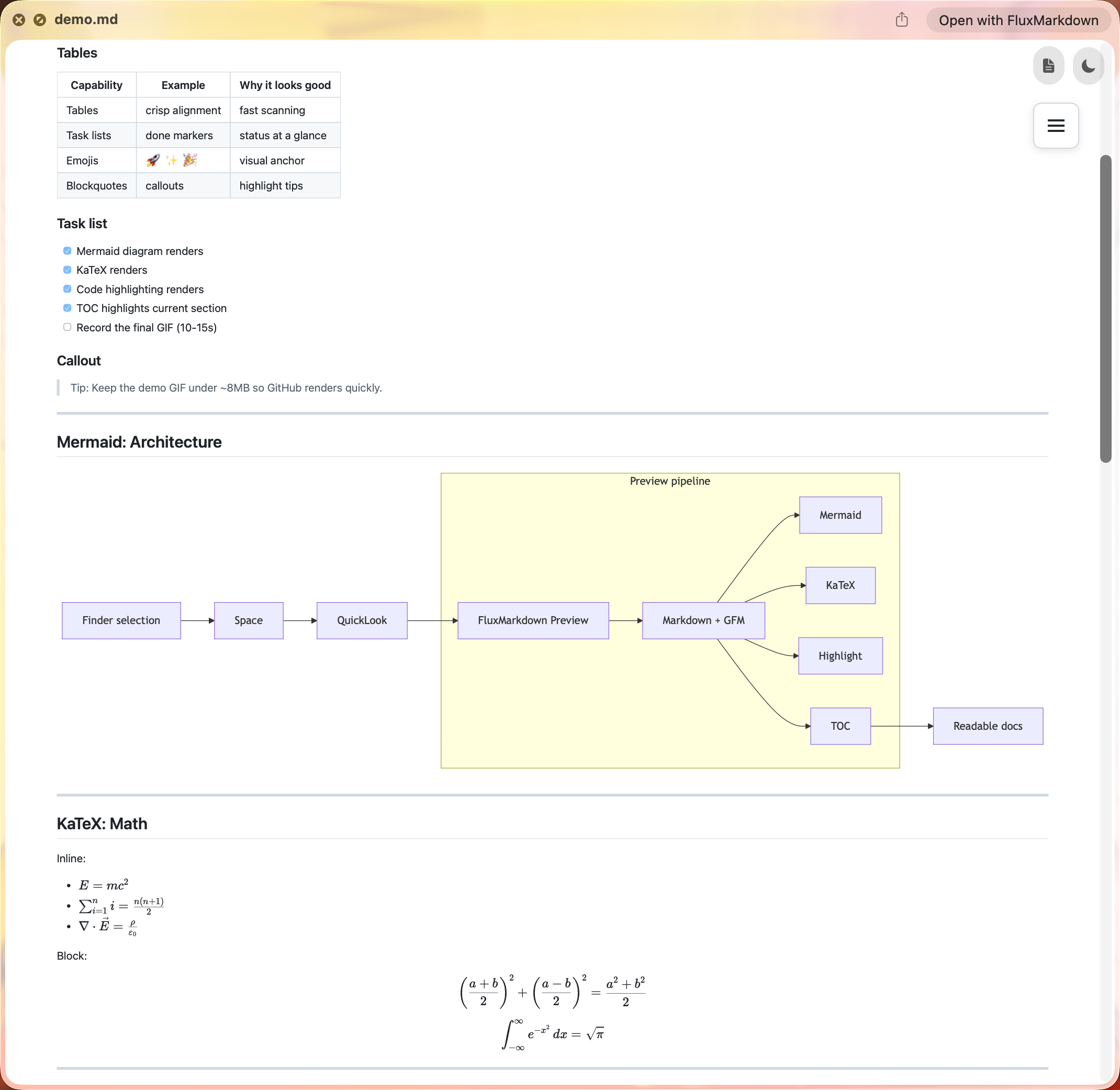 Quick look Markdown files with KaTex and Mermaid support.